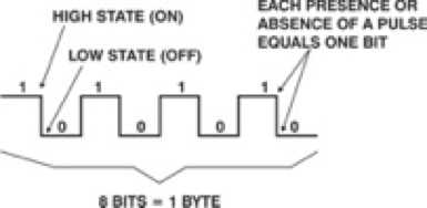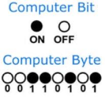 A bit is short for binary digit and is a single unit of information that can have a value of either 0 or 1 (off or on, false or true, low or high). Eight bits make a byte, as shown in the picture.